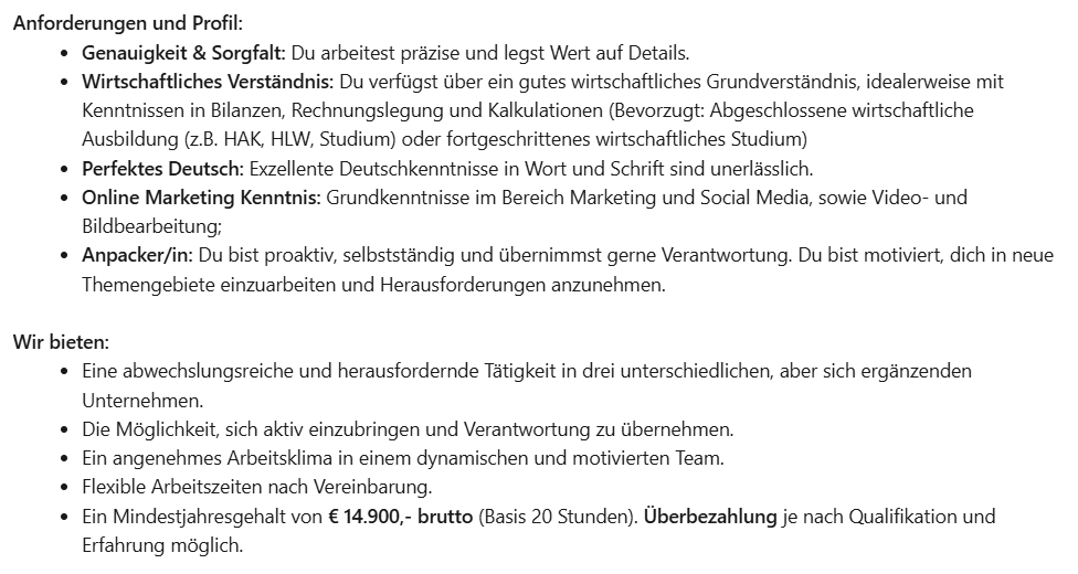 Der gesuchte Mitarbeiter braucht doch kaum etwas mitzubringen an Fähigkeiten und Eigenschaften. Ahnung von Bilanzen, Rechnungslegung und Kalkulationen, vorzugsweise ein wirtschaftliches Studium, exzellente Deutschkenntnisse in Wort und Schrift, Kenntnisse in Marketing und Social Media, das Beherrschen von Video- und Bildbearbeitung, Selbständigkeit, Proaktivität, die Bereitschaft, Verantwortung zu übernehmen, und Motivation. Das ist alles. Für Letztere sorgt ohnehin das großzügige Gehalt.